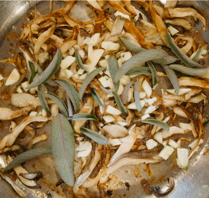 - Add pioppino mushrooms and sauté 5–7 minutes until browned.